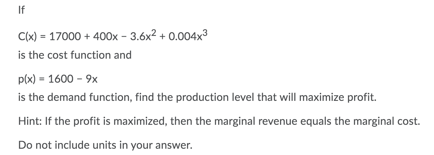 P x35 - 001x. Get an answer for find the production level that will maximize profit. If Cx 15000 600x 282 0004x3 is the cost function and px.